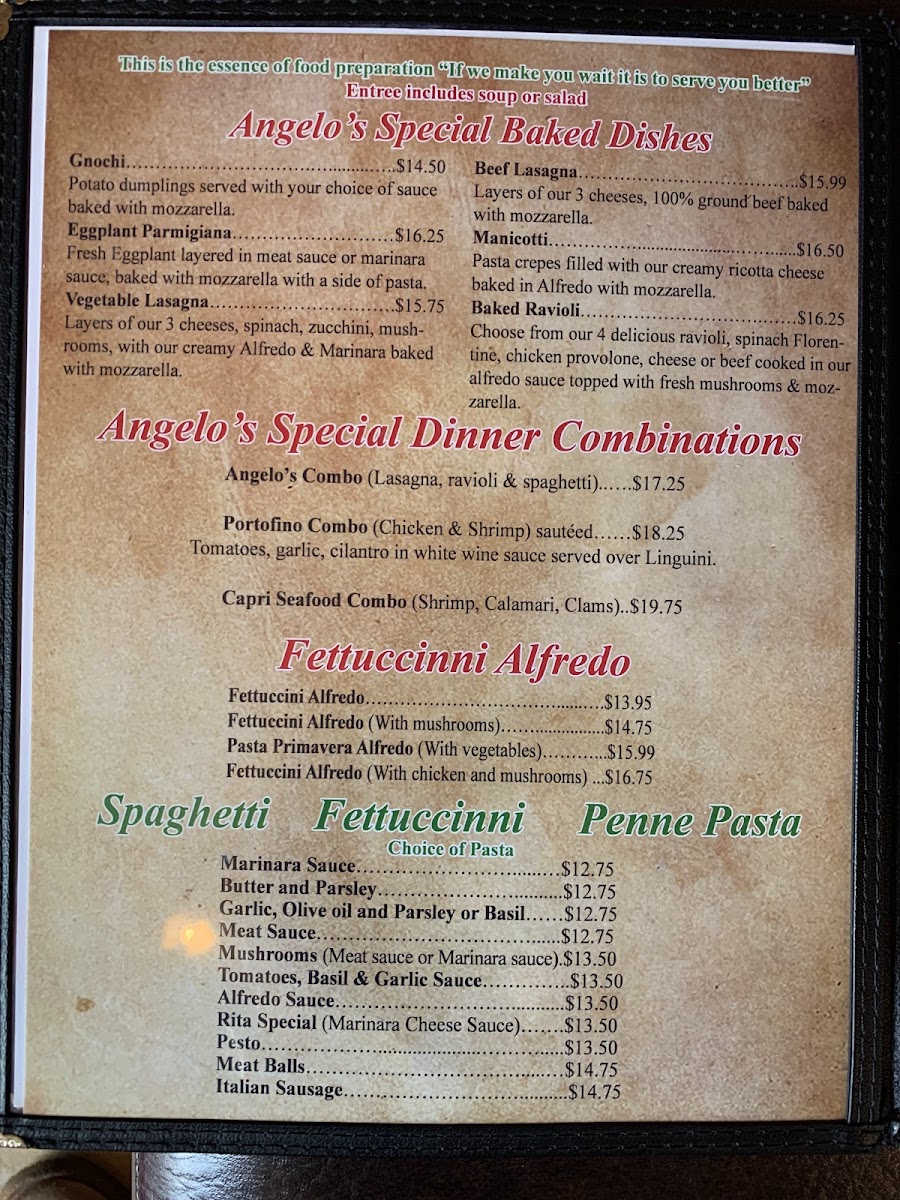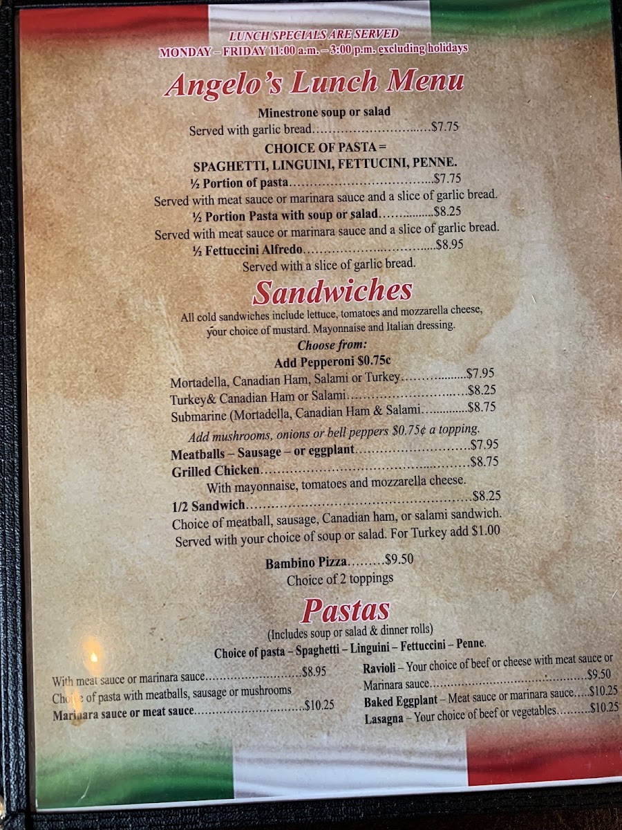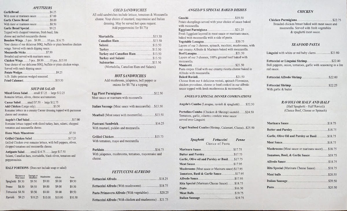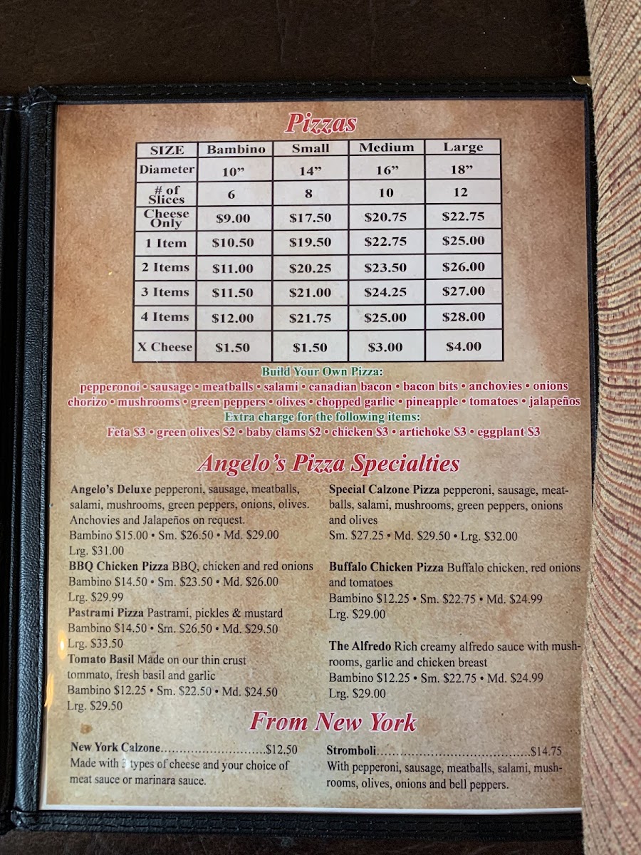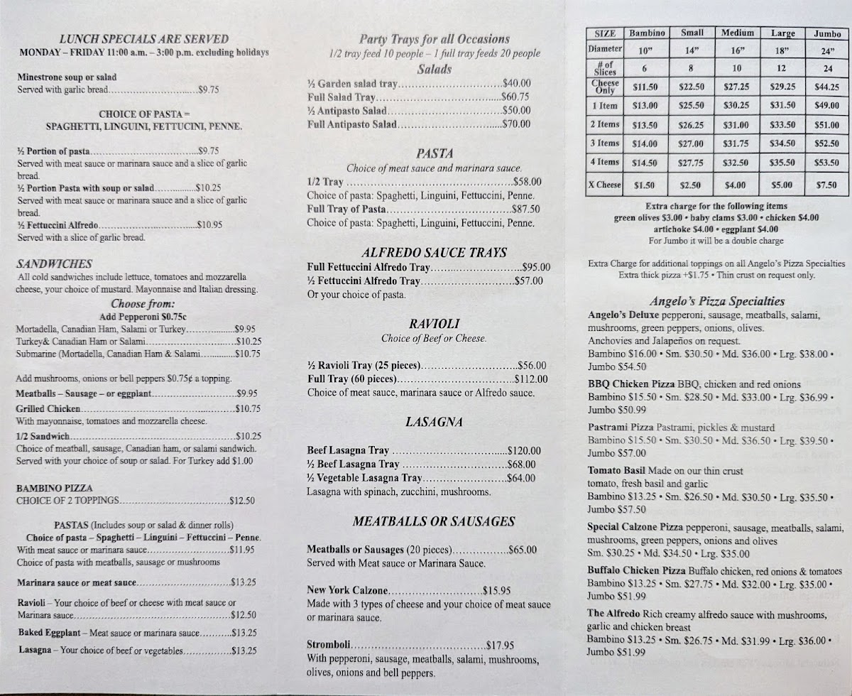 Pizza aficionados will adore the vast selection, including the delightful Tomato & Basil on thin crust and the indulgent Buffalo Chicken pie. The ravioli options offer a comforting twist, with choices including creamy alfredo or a savory meat sauce. With generous servings and vibrant flavors, each visit promises a warm and welcoming atmosphere paired with delightful dishes. Indulge in the authentic Italian experience that is Angelo's—your taste buds will thank you!