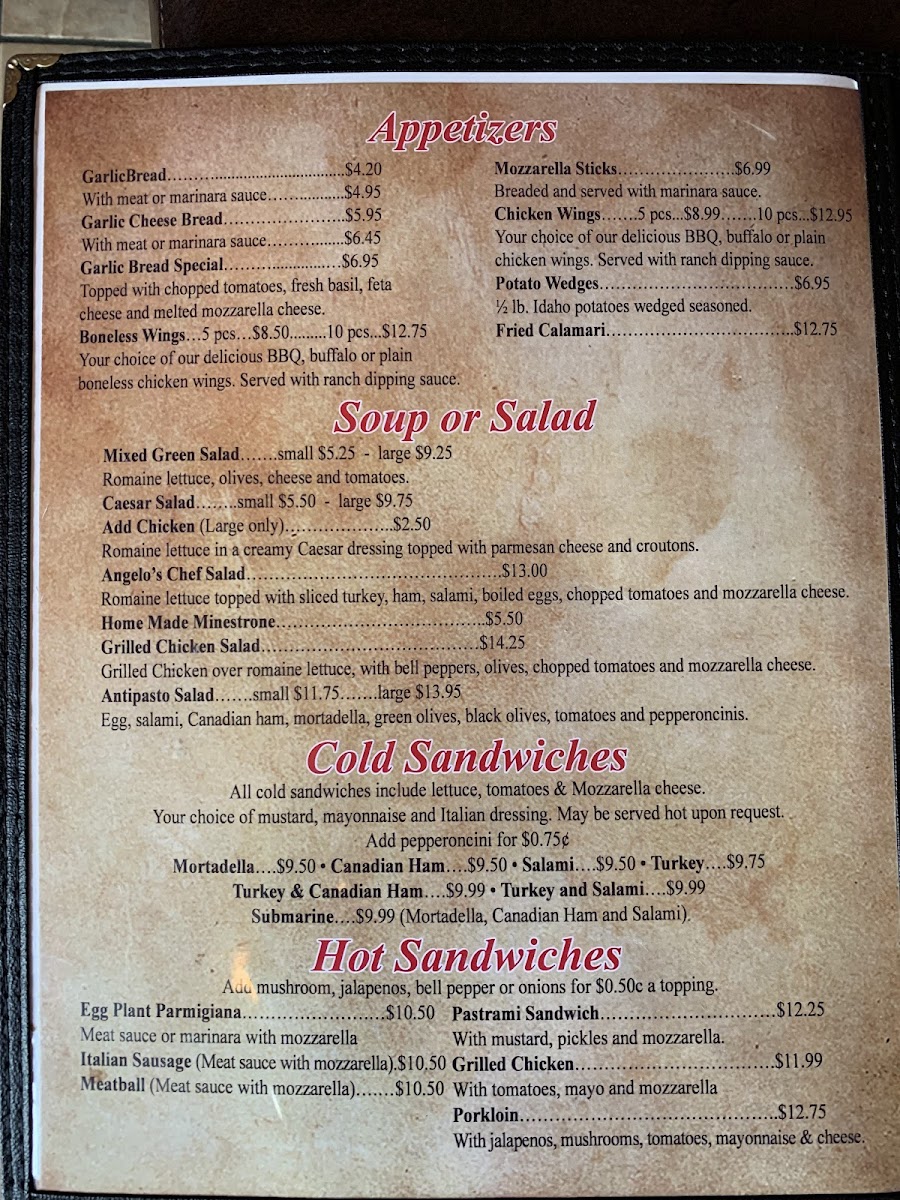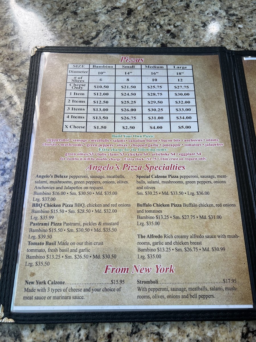 Welcome to Angelo's Italian Restaurant & Pizzeria, a culinary gem nestled in Alhambra, CA. This beloved eatery is a haven for Italian cuisine lovers, offering a menu bursting with authentic flavors and hearty portions. Start your meal with their famous meatballs or sausage, perfectly paired with rich marinara sauce. Dive into a slice of their signature New York Calzone, filled with three cheeses, or try the robust Stromboli loaded with assorted meats and fresh vegetables.